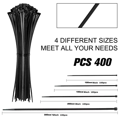 Cable Zip Ties,400 Pack Black Zip Ties Assorted Sizes 12+8+6+4 Inch,Multi-Purpose Self-Locking Nylon Cable Ties Cord Management Ties,Plastic Wire Ties for Home,Office,Garden,Workshop. By HAVE ME TD