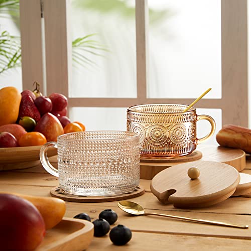 - YOU WILL GET: 4 vintage coffee cups(4 Translucent cups with embossed sunflower and raindrop patterns), 4 unique natural bamboo covers, 4 stainless steel spoons, and 4 cork coasters. This practical combination caters to your daily needs